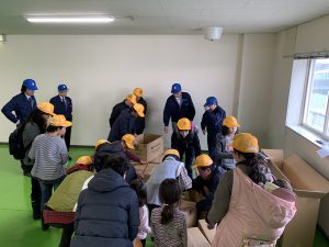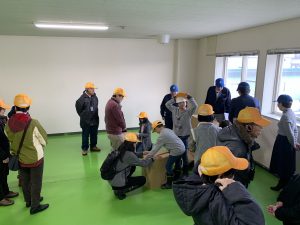 工場見学後に、全員で「段ボールベット」の組立を行いました。