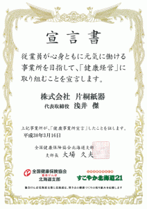 株式会社片桐紙器は従業員が心身ともに働ける事業所を目指して、「健康経営」に取り組むことを宣言します。
